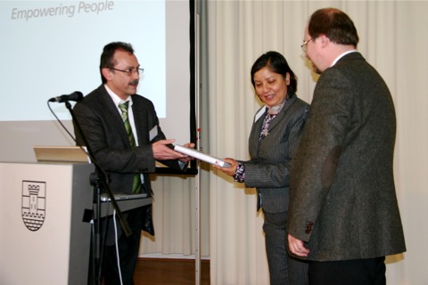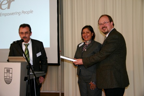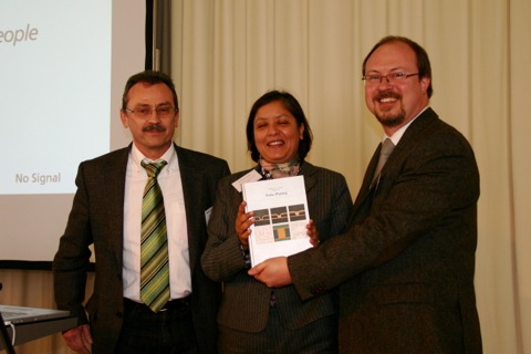 Gleichzeitig erfolgte die offizielle Überreichung des neu erschienenen Buches „Pulse Plating“ durch Herbert Käszmann, Chefredakteur des Eugen G. Leuze Verlages, an die beiden Autoren Prof. Dr. Sudipta Roy und Dr. Wolfgang Hansal.
